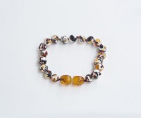 Opis: ručno pravljena od prirodnog Baltičkog ćilibara boje mozaik- tamno/bela. Tamni komadici ćilibara u omotu od polimerne bele gline. Namenjena bebama i deci svih uzrasta.